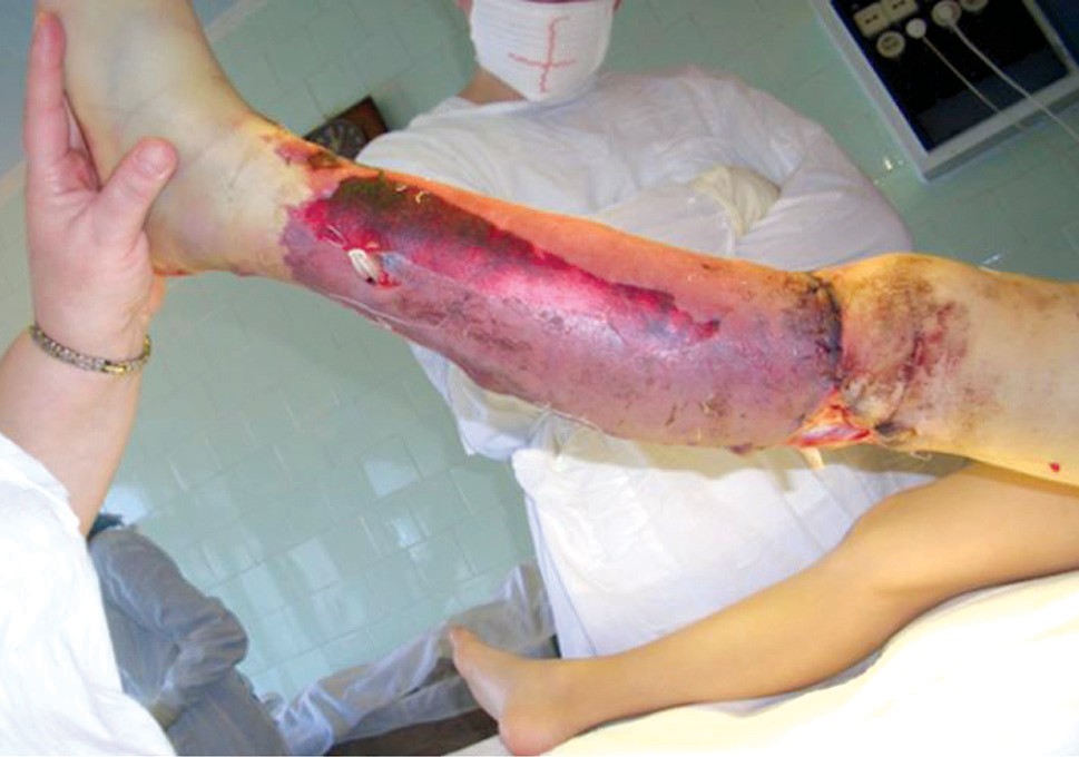 2. more than 11 % of the body area; it corresponds, for example, to the total damage to the integumentary tissues of the lower limb including the gluteal region (Fig. 4). The condition of the patients is characterized by traumatic and hemorrhagic shock even without damage to the great vessels. The general condition of the patient is severe or extremely difficult, requiring resuscitation measures, urgent surgical treatment in order to save patient’s life.