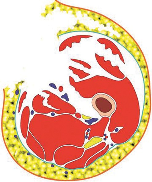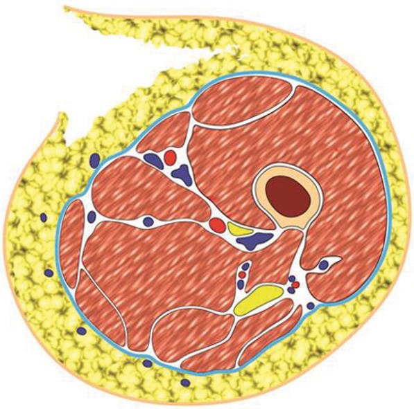 Fig. 7 Damage to the skin, subcutaneous fat, superficial fascia, crushing and muscle tissue defect. Sections are at the level of the middle third of the thigh. Authors’ diagram